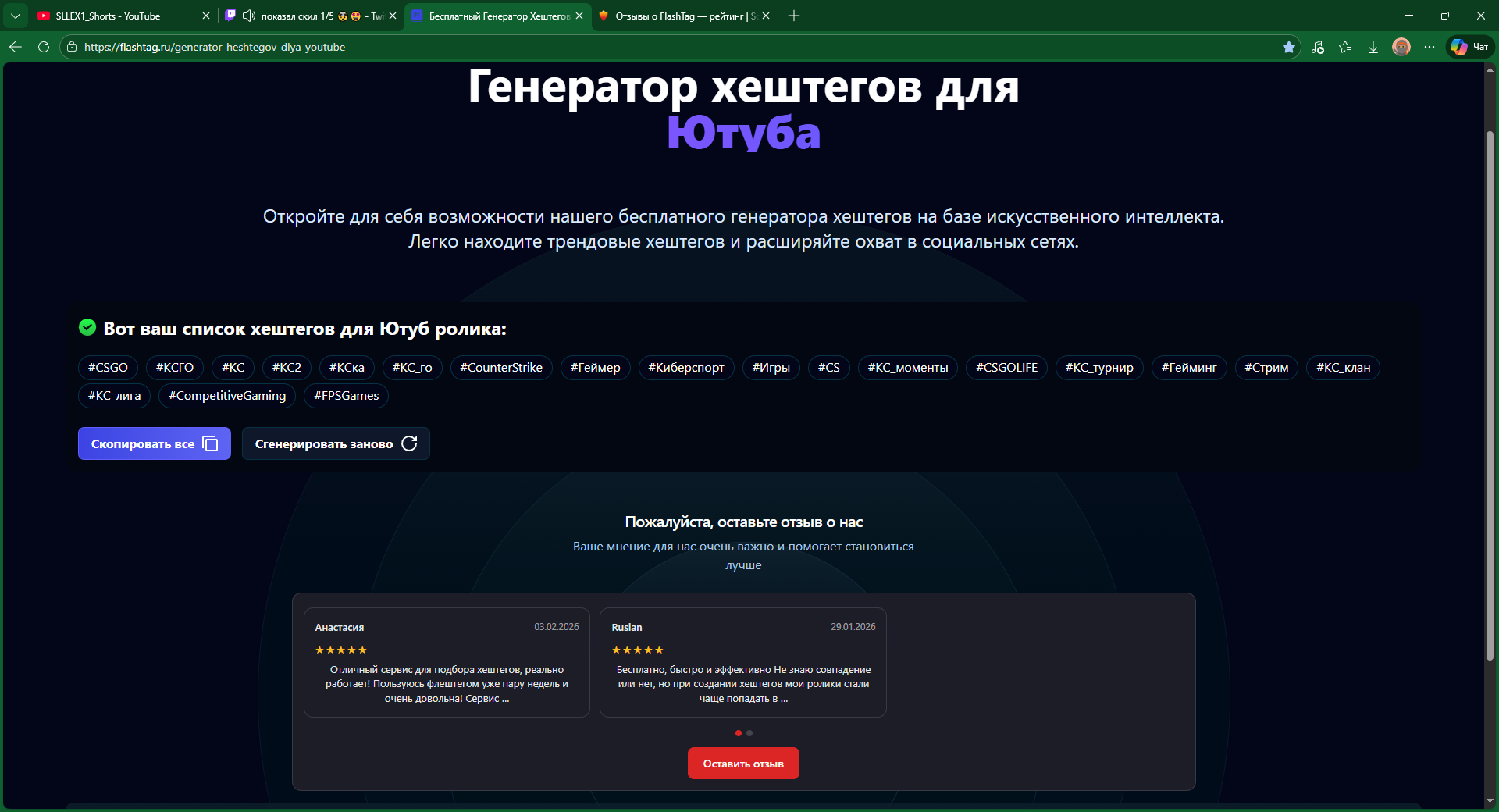 Уже третий месяц пользуюсь флештегом. Раньше сидел и морозился, пытаясь придумывать хештеги для своих видосов, а потом наткнулся на данный сайт. И больше не придумываю) Теперь он делает все за меня. Автору респект! Ресурс отличный, рекомендую его также друзьям